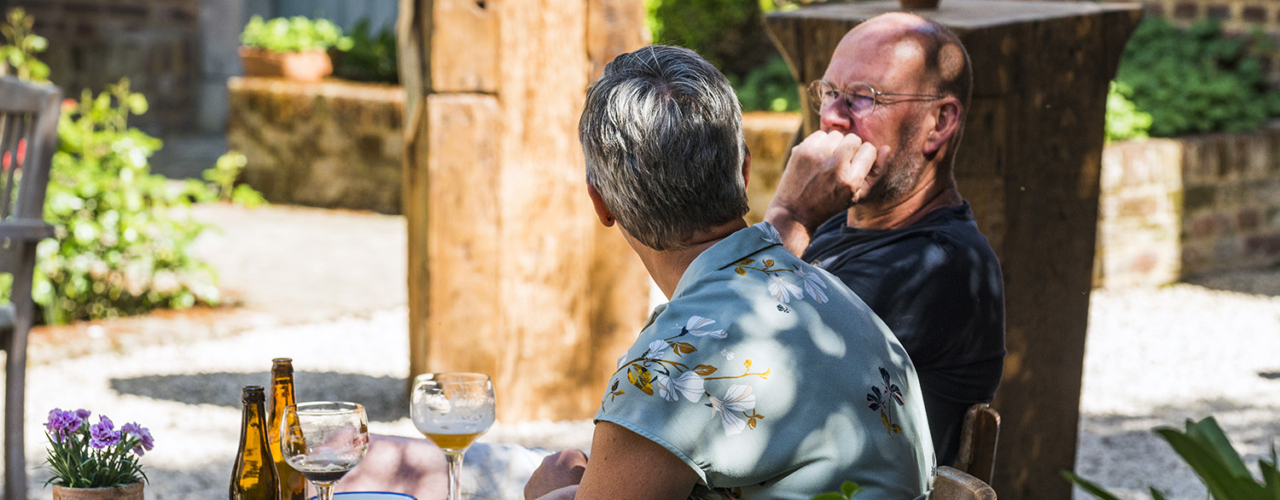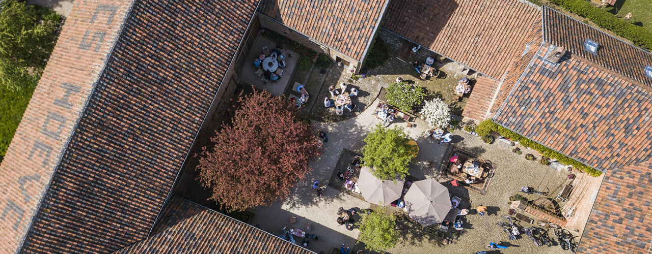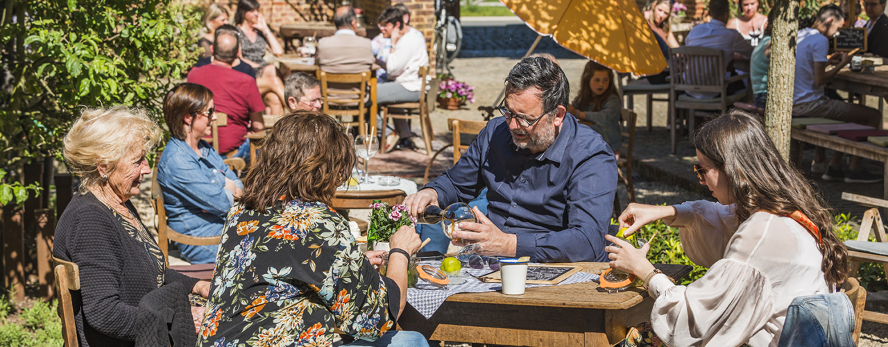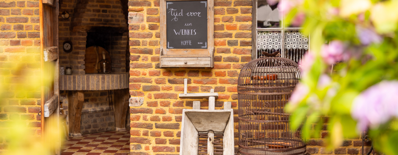 Ons terras is gelegen op de binnenkoer van de vierkantshoeve. Als de zon van de partij is en de bloesems de omgeving kleuren, is het heerlijk verpozen op ons terras. Gezelligheid troef!